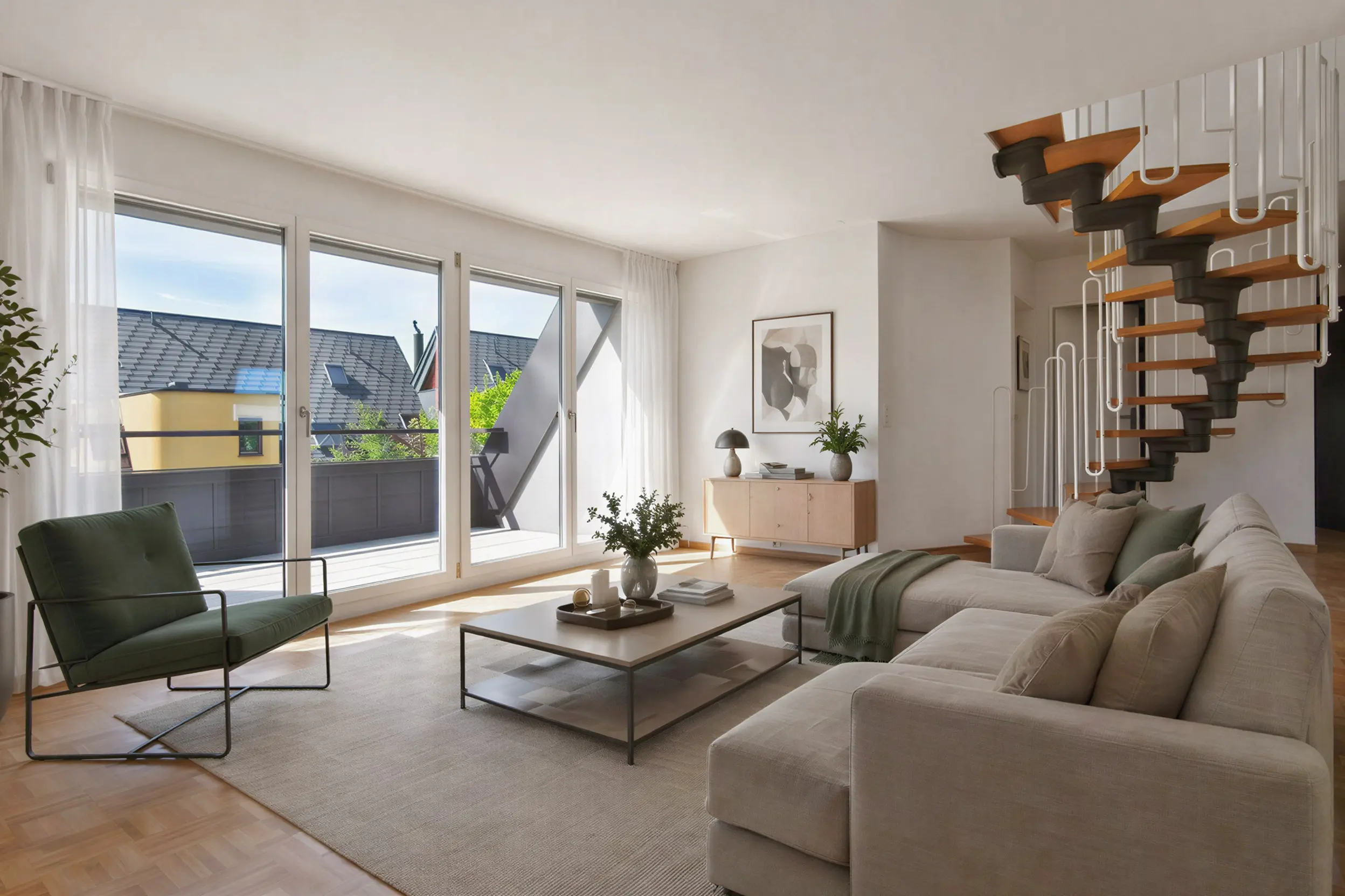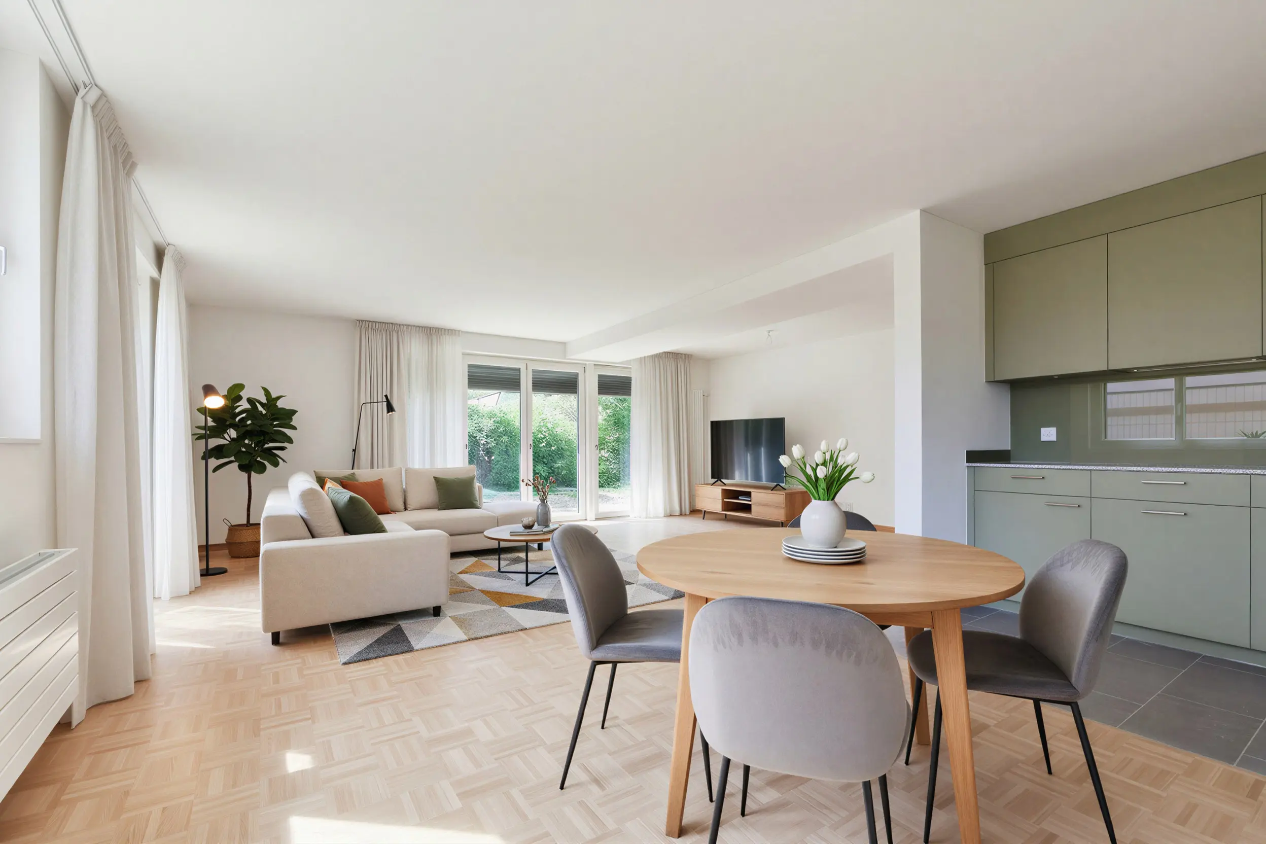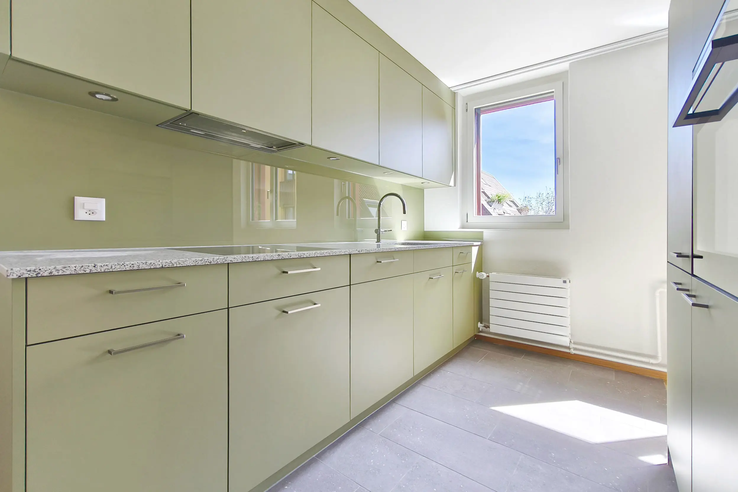 Die Küchenfronten in der Farbe Pistazie setzen einen modernen, eigenständigen Akzent. Das Haus umfasst insgesamt sechs Wohneinheiten mit einem ausgewogenen Wohnungsmix: Drei 5.5-Zimmer-Wohnungen, eine 4.5-Zimmer-Wohnung sowie zwei 3.5-Zimmer Maisonettewohnungen. Das Projekt richtet sich an unterschiedliche Lebensmodelle und bietet modernen Wohnraum mit individuellem Charakter